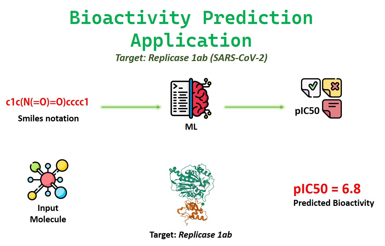 pIC50 Values: Predicts bioactivity values for the uploaded molecules and evaluates the potential effectiveness against COVID-19.